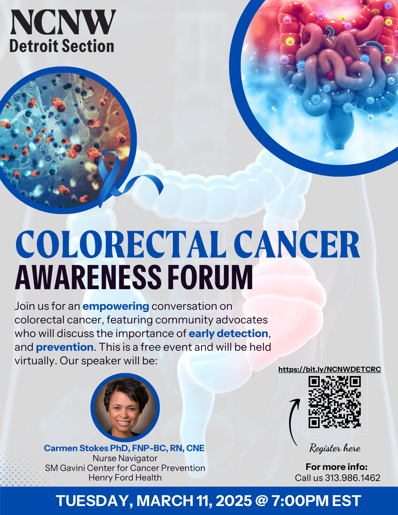 March is Colorectal Cancer Awareness Month! Join us for an empowering conversation on colorectal cancer, featuring community advocates who will discuss the importance of early detection, and prevention. Learn how to protect yourself and your loved ones from this preventable disease. This is a free community awareness event and open to all. The forum will be held virtually. Our speaker will be Dr. Carmen Stokes of Henry Ford Health.
